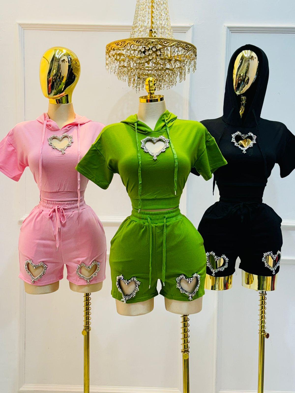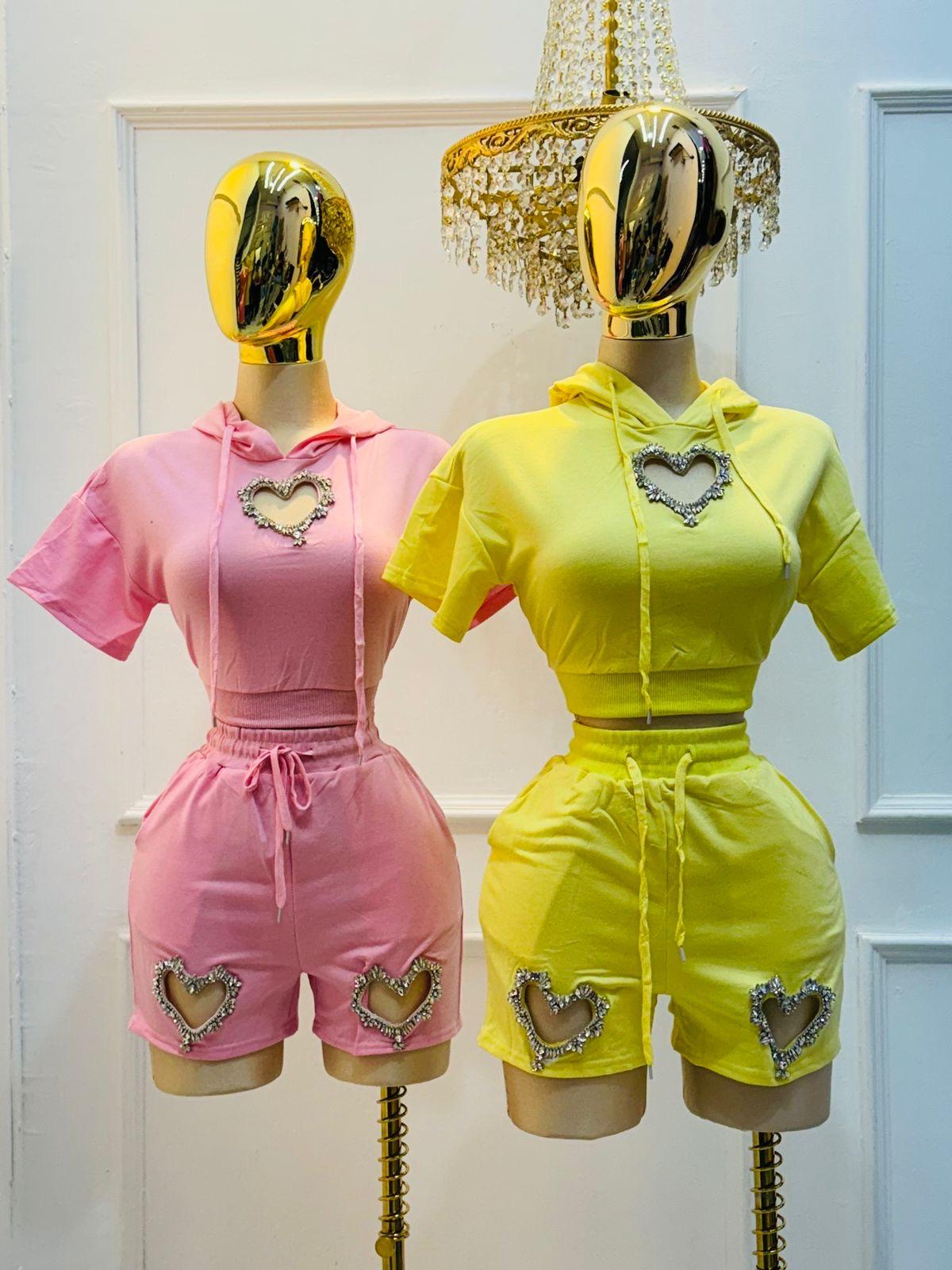 This stylish two-piece set features a cropped short-sleeve hoodie paired with high-waisted shorts, adorned with sparkling rhinestone heart cut-outs. Available in pink, green, black, and yellow, this set offers both comfort and a trendy, eye catching design. While the rhinesonte accents add a touch of.. GLAM.